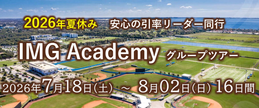 【ツアーの内容】 羽田空港集合、引率者共にサラソタ空港へ。バスにてIMGアカデミーに移動し、IMGコアキャンプ参加費(全トレーニング・敷地内寮宿泊費・食事3食・現地サポート・アクティビティ参加費。8月1日、バスにてIMGアカデミーを出発し、サラソタ空港へ。羽田へのフライト利用。全日程引率者あり。